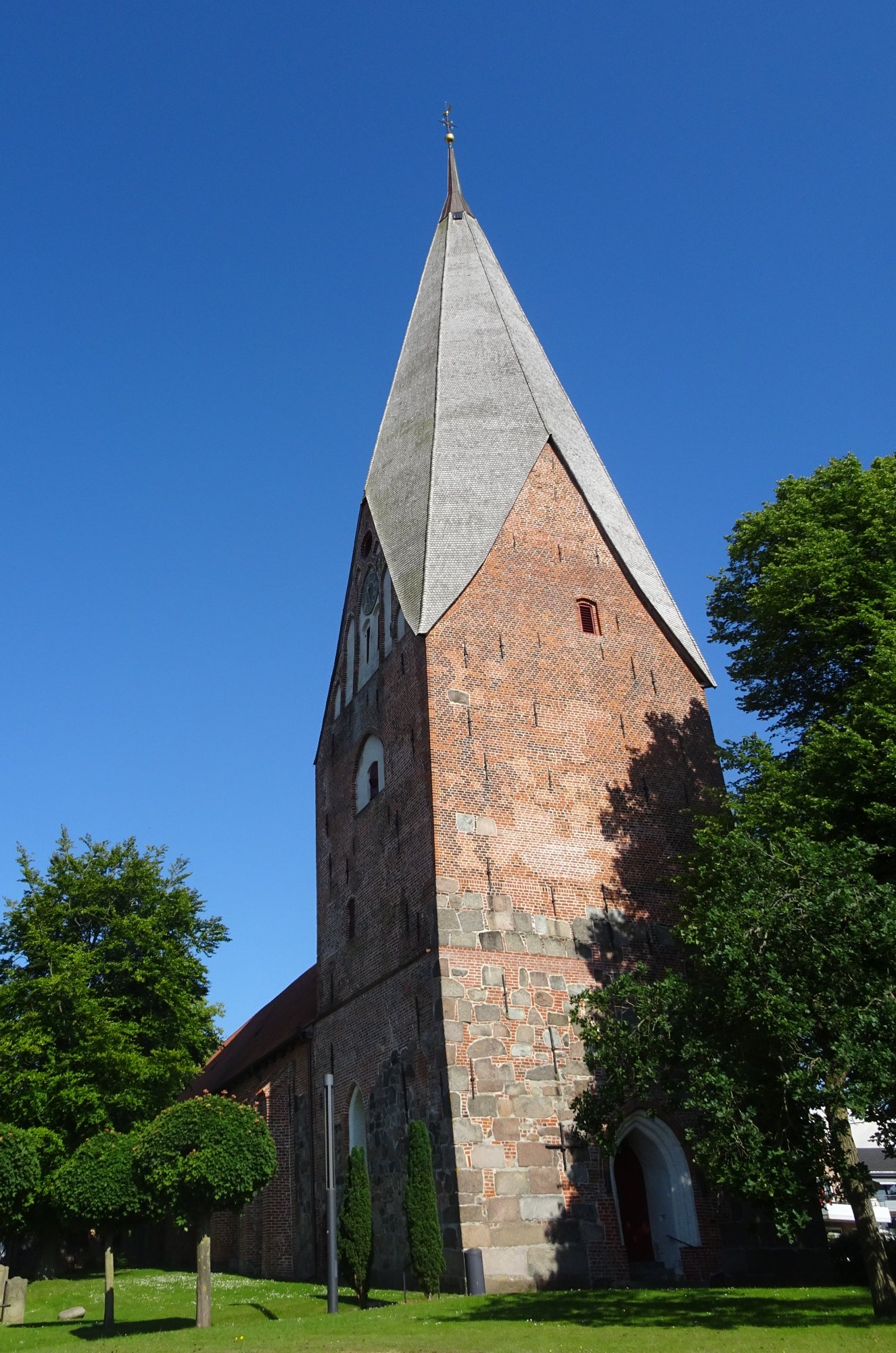 Gettorf empfängt die Pilger mit einer Kirche mit riesigem Kirchturm. Verwirrend waren die komischen Pfeile auf dem Bürgersteig. Später fanden wir heraus, dass ein Straußenvogel mit einem Eimer gelber Farbe die Spur zum Tierpark gelegt hat.